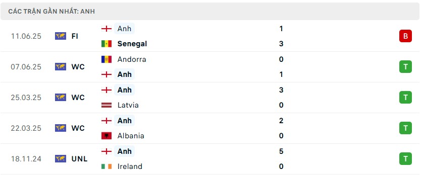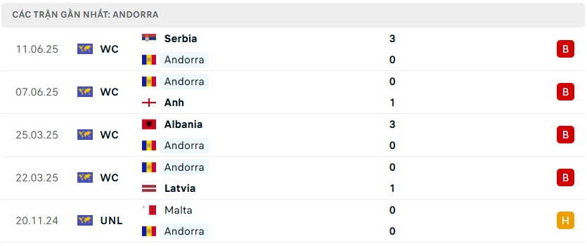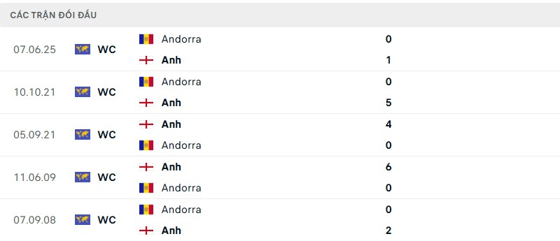 Nếu nhìn vào thành tích đối đầu, sự chênh lệch còn trở nên rõ ràng hơn. Sáu lần gặp nhau trong quá khứ, Anh toàn thắng, ghi nhiều bàn mỗi trận và chưa từng để lọt lưới. Trong 5 lần chạm trán gần nhất, Andorra đều thất bại, trong đó có những trận thua đậm tới 6-0, 5-0.