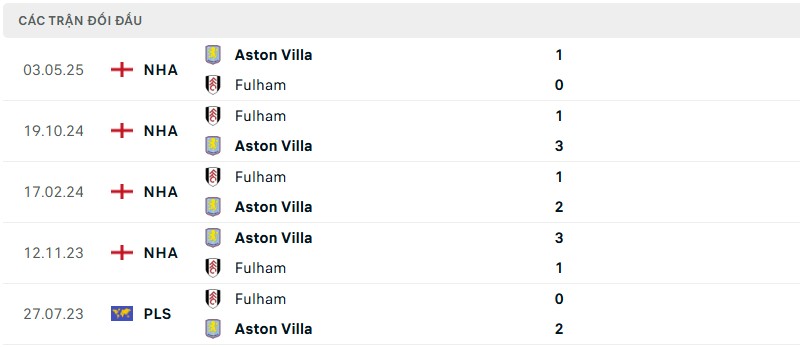 Lịch sử đối đầu lại mang đến sự thú vị riêng. Trong 5 lần gặp nhau gần nhất, Aston Villa đều là đội giành chiến thắng trước Fulham, bao gồm trận đấu hồi tháng 5/2025, nơi Tielemans ghi bàn duy nhất giúp Villa thắng 1-0. Khi ấy, đoàn quân của Emery không chơi vượt trội nhưng biết cách tận dụng cơ hội.