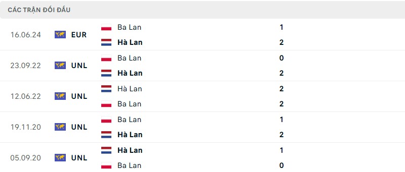 6 lần đối đầu gần nhất giữa hai đội đang ghi nhận sự vượt trội đến từ Hà Lan. Cơn lốc màu da cam thể hiện đẳng cấp với 5 chiến thắng và chỉ phải nhận 1 trận hòa. Lần đối đầu gần nhất diễn ra tại kỳ Euro 2024, Hà Lan đã có màn lội ngược dòng đẳng cấp để hạ gục Ba Lan 2-1.
