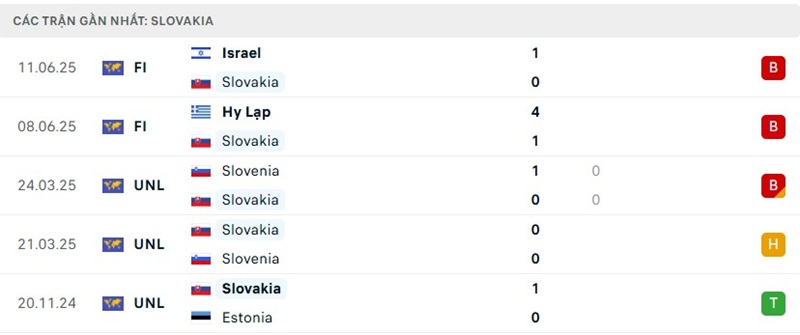 Trong khuôn khổ giải đấu quốc tế gần nhất là kỳ Nations League, tuyển Slovakia cũng đã thất bại ngay lượt trận đầu tiên của playoff với tỉ số tối thiểu trước Slovenia sau 2 lượt trận. Đội tuyển này cũng đã bỏ lỡ tới 3 giải World Cup lần nhất và trong bảng A vòng loại châu Âu, đối thủ của họ lần lượt là Đức, Luxemburg cùng Bắc Ireland.