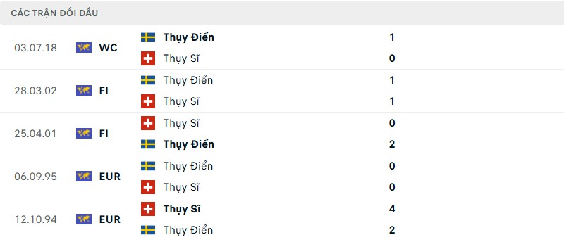 Thành tích đối đầu giữa Thụy Điển vs Thụy Sĩ